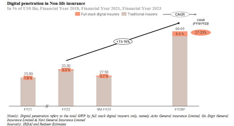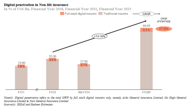 Digital full stack insurance companies have been progressively gaining market share from incumbents. Go Digit GWP grew by approximately 37.5% while the private non-life insurers (excluding standalone health insurers) overall grew by 20.1% in FY23. Go Digit caters for approximately 82.1% of the GWP of the digital full stack insurance players in FY23. ( Go Digit, Acko, Navi)